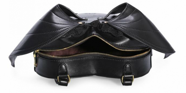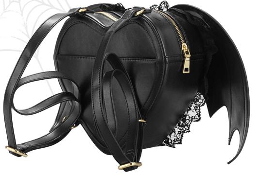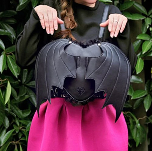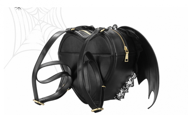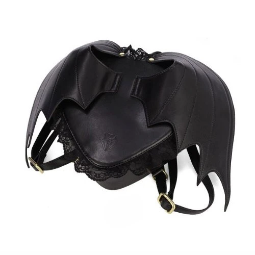 The black PU faux leather bat-winged back-pack for your personal items is ideal for the dark spirit inside you! It is trimmed with black lace, has a zippered opening with adjustable straps and is lightweight as well.