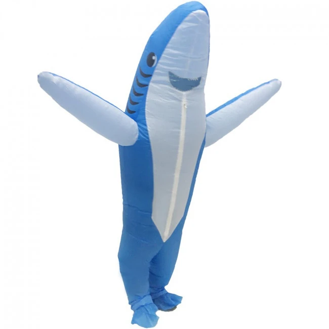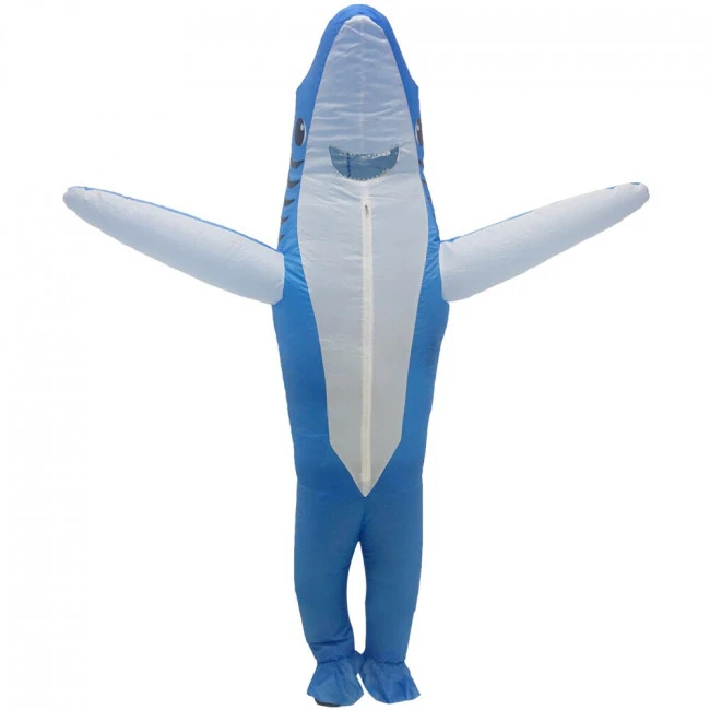 Blue Shark Inflatable Costume. This full-body inflatable jumpsuit has multicolor scratch marks and printing to show the most realistic visual effect.