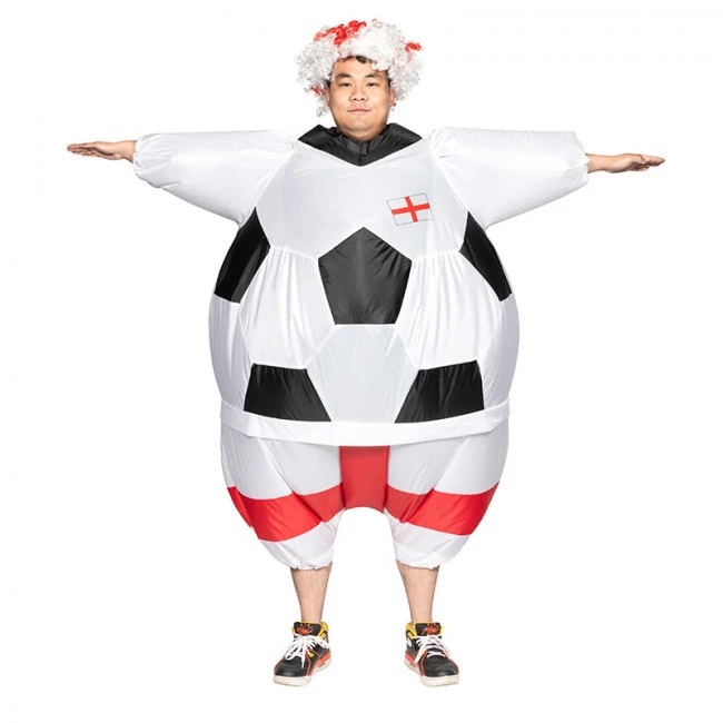 England Football Club Inflatable Costume. The adult Halloween costume needs you to tighten the outer ring in place to hold the fan before you put on the costume, otherwise the loose outer ring may cause the fan to fall off during movement.