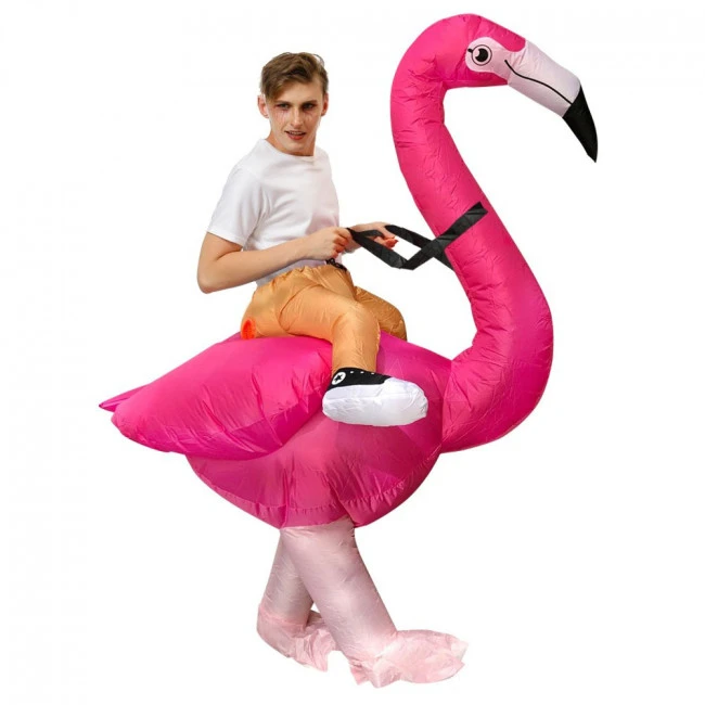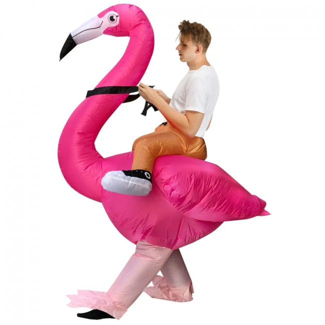 Riding Flamingo Inflatable Costume. The Halloween / Easter costume is made with 100% polyester that is strong and durable so that you will never have to worry about any tears or holes.